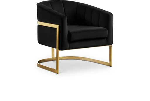 The Carter Black Velvet Accent Chair is a stunning addition to any modern living space. Its luxurious black velvet upholstery and sleek design make it a standout piece. The chair's gold stainless steel base adds a touch of elegance and sophistication.