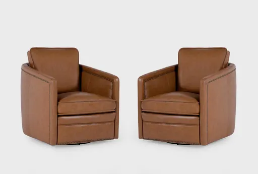 Introducing the Carvell Cinnamon Leather 30" Swivel Barrel Arm Chair Set Of 2, perfect for enhancing your living room space. These traditional-style armchairs offer both comfort and functionality with their swivel feature, allowing for easy movement and positioning. Made from a combination of leather, foam, hardwood, and steel, these chairs are built to last and provide a sophisticated touch to any room.
