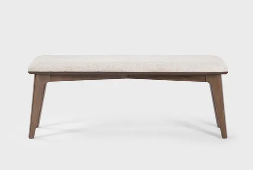 Casey Walnut Cream Upholstered Dining Bench pairs a softly padded cream seat with a warm walnut veneer frame to bring comfortable, practical seating to modern dining rooms. Its narrow, armless profile slides easily under a table to keep traffic flowing while tapered rubberwood legs add mid-century modern balance and reliable stability. The long seat comfortably accommodates two adults, making it useful for family meals or as extra seating in a kitchen or entryway.