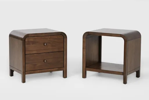 Casey Walnut two-piece nightstand set pairs a 2-drawer nightstand with a coordinating night table to give your bedside flexible, organized storage. Designed in mid-century modern fashion with rounded corners and tapered legs, the pair uses walnut veneer and rubberwood for reliable everyday performance. Drawers keep small items out of sight while the open shelf is ideal for books or a bedside lamp, helping you create a calm, functional bedroom setup.