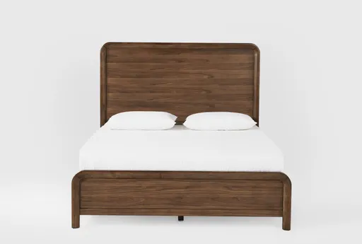 Casey Walnut Queen Panel Bed brings mid-century modern warmth to the bedroom with a clean panel headboard and a low-profile platform that centers your space. The bed features a solid rubberwood frame finished in walnut veneer for reliable support, while the slatted platform promotes mattress ventilation. Simple assembly and a durable finish make it practical for everyday use, giving you a calm foundation. Panel headboard with horizontal slat detailing that provides a warm focal point and pillow support. Frame built from solid rubberwood with walnut veneer to balance strength and a consistent finish. Queen platform supports a standard queen mattress and is compatible with a box spring if you prefer added height.