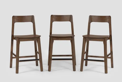 Casey Walnut Wood Counter Height Stool Set Of 3 brings modern, mid-century-influenced seating to your kitchen or dining counter. Each armless counter-height stool features a walnut veneer seat paired with solid rubberwood components and tapered conical legs with an integrated footrest for comfortable perching. The low, supportive back provides everyday comfort while the three-piece set makes it easy to outfit an island or dining area.