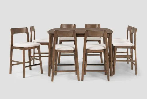 Casey Walnut Wood Extendable Counter Height Table With 8 Upholstered Counter Height Stools brings modern presence to your dining room and kitchen with a square, extendable table and a matching set of eight armless stools. A brown walnut veneer tabletop and wood frame combine with tapered legs and soft rounded corners to create a clean mid-century modern silhouette, while the stools' curved backs add supportive comfort and a refined profile. The extendable design includes an integrated extension leaf so you can expand seating for guests without sacrificing everyday counter-height functionality.