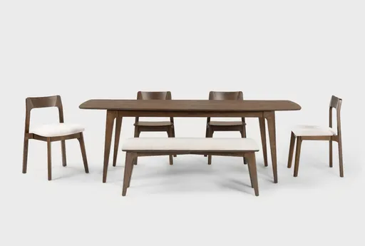 Casey Walnut Wood Extendable 72-90" Dining Table With 2 Upholstered Chairs And 2 Wood Chairs And Upholstered Bench brings Mid-Century Modern practicality to your dining room with an extendable surface that adapts to weekday meals and larger gatherings. The table pairs a rubberwood frame with a walnut veneer top and tapered conical legs for stable support, while the seating mix includes two armless upholstered chairs, two wood chairs with tight backs and an upholstered bench for flexible arrangements. This 6-piece set blends comfortable fabric seating and durable wood detailing to make hosting and everyday dining both functional and inviting.