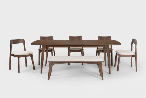 Casey Walnut Wood Extendable 72-90" Dining Table With 2 Upholstered Chairs And 3 Wood Chairs And Upholstered Bench is a modern 7-piece dining set that expands from 72 to 90 inches with an extension leaf, giving extra seating and serving space for family meals. The rectangular table pairs a walnut veneer top with solid rubberwood tapered legs for stable support, while the mix of fabric-upholstered and wood seating brings a mid-century modern influence. Two upholstered chairs and an upholstered bench offer cushioned seats with tight backs, and three armless wood chairs tuck neatly under the table when not in use, making this set practical for everyday dining.