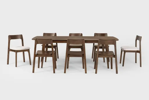 Casey Walnut Wood Extendable 72-90" Dining Table With 2 Upholstered Chairs And 6 Wood Chairs brings a modern, mid-century influenced presence to the dining room and expands from 72 to 90 inches to comfortably seat eight. The rectangular table pairs a walnut veneer top with rubberwood tapered legs for stable support, while two tight-back, fabric-upholstered end chairs and six armless wood chairs provide versatile seating. An extension leaf lets you add room for guests, making this set practical for everyday meals and dinner gatherings.