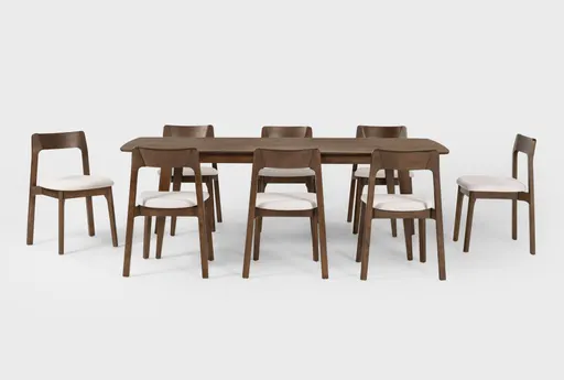 Casey Walnut Wood Extendable 72 to 90 Inch Dining Table With 8 Upholstered Side Chairs brings flexible, modern dining to your home with a rectangular table that expands as your gatherings grow. The table extends from 72 to 90 inches with a removable leaf to add food prep and serving space, while tapered conical legs keep the piece grounded and stable. Eight armless, tight back side chairs with fabric upholstery offer comfortable support so the nine-piece set seats eight for everyday meals or dinner parties.