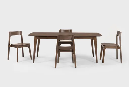 Casey Walnut Wood Extendable 72-90" Dining Table With 4 Wood Side Chairs is a modern five-piece dining set that expands from 72 to 90 inches with an extension leaf, giving extra tabletop for seating and food prep and serving when you need it. The table pairs a walnut veneer top with a rubberwood frame and tapered conical legs that nod to mid-century modern design, while four armless wood side chairs feature tight backs and fabric-upholstered seats for comfortable everyday dining. Practical construction and a clean silhouette make this set a versatile choice for weekday meals and larger gatherings.