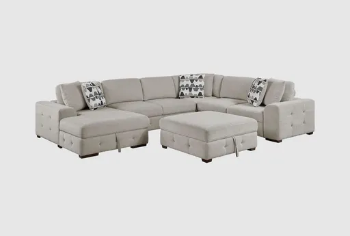 Casoria Taupe 5 Piece Sectional with Left Chaise And Storage Ottoman balances plush comfort with practical function, featuring a left-facing chaise, a twin-size sleeper, and a storage ottoman to expand seating and stow linens. Upholstered in 100% polyester, the sectional sits on a pine and plywood frame with reinforced joinery for reliable support, while plush cushions with resilient foam fill offer comfort for lounging. The five-piece configuration adapts to a variety of living room layouts and makes hosting easier by providing overnight sleeping space and hidden storage.