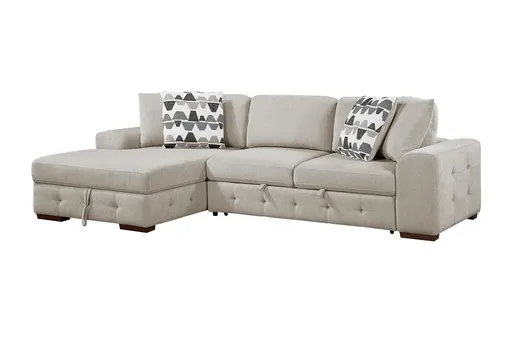 The Casoria Taupe 2 Piece Sectional With Left Chaise makes everyday living more comfortable and guest-ready, combining a roomy left-facing chaise with an integrated twin sleeper. Upholstered in taupe 100% polyester fabric over a pine and plywood frame, the piece pairs plush seating and a tufted base with practical durability. Its two-piece layout allows flexible placement in living spaces while the sleeper provides a simple solution for overnight visitors. Twin sleeper that converts easily for overnight guests. Left-facing chaise for lounging and extra seating. Frame with pine and plywood and polyester upholstery plus a tufted base.
