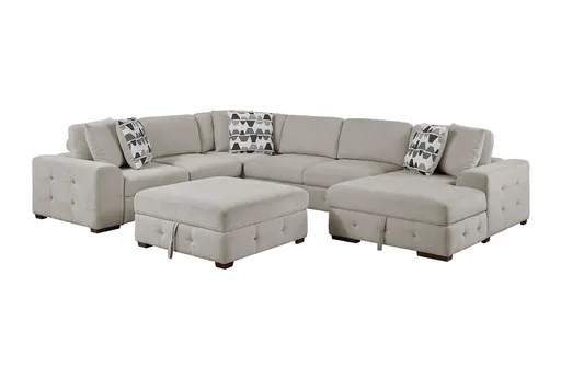 The Casoria Taupe 5 Piece Sectional with Right Chaise and Storage Ottoman is the perfect addition to your living room. Crafted from pine and plywood, this sectional is upholstered in durable 100% polyester fabric. Enjoy the convenience of a right-facing chaise and a storage ottoman for added functionality. Includes a sleeper design for extra versatility. Features a twin size secondary sleeping option. Equipped with storage ottoman for additional space.