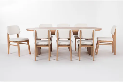 Our Scandinavian-inspired Catania dining set takes an on-trend look and makes it timeless, so you can enjoy designs that will forever be in style. Embodying an organic modern style aesthetic, each piece offers natural appeal that’s elevated by special materials and details. European red oak and oak veneer, plus solid wood, instill strength and beauty, while boucle fabric on the dining chair adds distinction and comfort. The pedestal base table’s smooth curves and oval shape add grace and elegance.