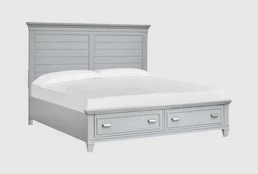 Introducing the Catherine Grey California King Wood Panel Bed with Footboard Storage, a perfect blend of style and functionality for your bedroom. This coastal-inspired bed boasts a beautiful harbor grey finish and offers ample storage with its footboard drawers. Crafted from MDF and solid Asian hardwood, this bed frame ensures durability and a timeless appeal.