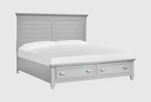 The Catherine Grey King Storage Bed is a coastal-style bed made from MDF and solid Asian hardwood. Its harbor gray color adds a serene touch to any bedroom. Features bolt-on rails for added stability, includes slats with support legs for enhanced comfort, and comes with floor protectors to prevent scratches on your floor.