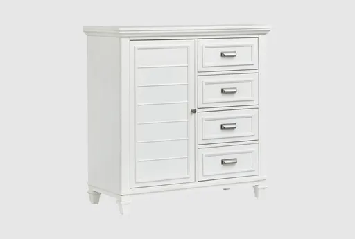 Introducing the Catherine White 4-Drawer 1-Door Bedroom Wardrobe Closet, a perfect addition to your coastal-inspired bedroom. With its White Dove finish and timeless design, this wardrobe closet offers a blend of functionality and style. Constructed from MDF and solid Asian hardwood, it promises durability and ample storage for your bedroom essentials.