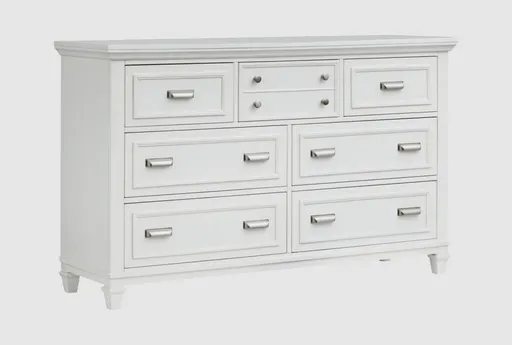 The Catherine White 7-Drawer Dresser brings a touch of coastal charm to your bedroom with its elegant White Dove finish. Crafted from MDF and solid Asian hardwood, this dresser combines durability with a stylish design. The seven drawers, including three felt-lined top drawers, offer ample storage space for all your essentials.