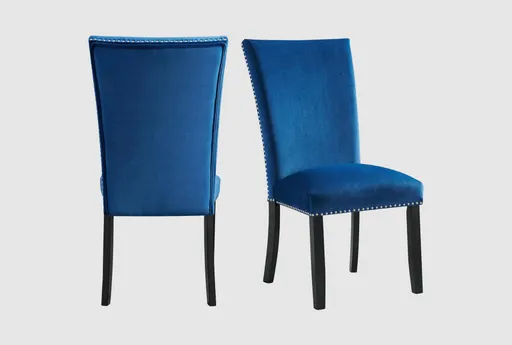 Enhance your dining experience with the Celina Upholstered Blue Velvet High Back Dining Side Chair Set Of 2. These modern chairs, with a touch of glam, feature a stunning blue velvet fabric that adds a pop of color to any dining space. The chic black finish on the legs and chrome nail head trim provide a sophisticated and elegant look. Includes: Two Chairs, Blue, Velvet Fabric, Chrome, Nail Head Trim.