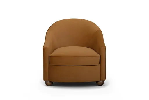 Cettie Cognac Velvet Accent Chair pairs a compact, curved silhouette with a cozy, enveloping seat that works perfectly in a reading nook, bedroom corner, or next to a sofa. Upholstered in polyester velvet in a warm cognac brown, the chair features a medium-firm cushion and low arms for comfortable, supportive seating. Sturdy rubberwood bun feet provide a grounded, low-profile base that keeps the look balanced and approachable.