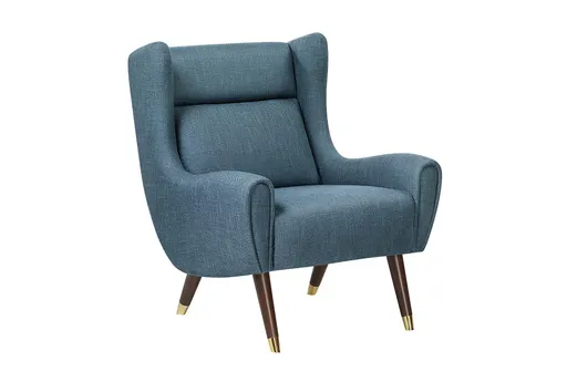 The Chandler Blue Accent Chair brings mid-century modern flair to the living room with a supportive headrest and a gently winged profile that works for reading or relaxed lounging. A frame of plywood and hardwoods supports foam seat cushions for reliable comfort, while tapered pine legs with metal ferrules provide stable footing. Upholstered in 100% polyester, the fabric resists everyday wear and is easy to maintain so this chair fits seamlessly into daily life.