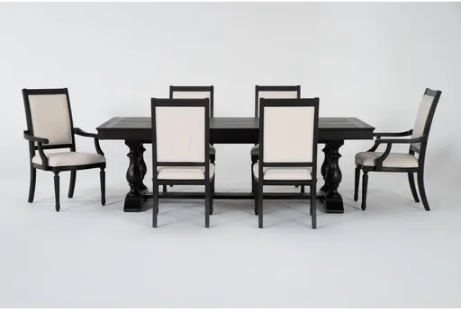 The Chapleau III Black Wood 92-120" Extendable Double Pedestal Dining Set is perfect for any dining room or kitchen. This traditional set features a rectangular table made from hickory veneer and solid poplar, ensuring durability and long-lasting use. The set includes six cushioned chairs, providing comfort and style for your dining experience.