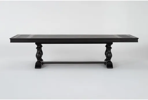 The Chapleau III Black Wood Rectangular Extendable Double Pedestal Dining Table is a stunning addition to any dining room or kitchen. With its traditional style and rich black finish, this table brings a timeless charm to your home. The table is designed to extend from 92 inches to 120 inches, making it perfect for hosting large gatherings.