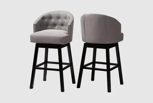 Enhance your dining room or kitchen with the Charlize Grey Fabric Upholstered Wood Swivel Barstool Set. These modern barstools feature a stylish grey fabric and espresso rubberwood legs, providing a sophisticated touch to any space. The tufted design and nailhead trim add a touch of refinement, while the swivel function ensures comfort and convenience.