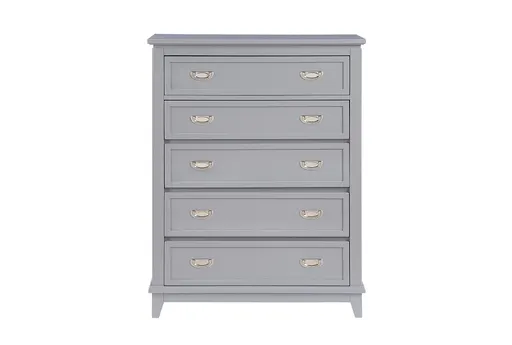 The Chase Grey Wood 5-Drawer Chest is a perfect addition to any kids' bedroom or sleeping room. Its traditional style and soft grey color blend seamlessly with various decor themes, providing both functionality and aesthetic appeal. Made from pine wood and MDF, this chest offers durability and ample storage space with its five drawers.