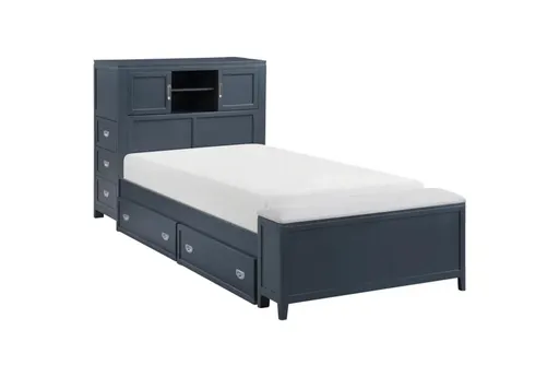 Chase Navy Twin Wood Bookcase Bed With Footboard Storage Bench Double Sided Storage Drawers Hidden Pull-Out Desk & Stool | Furnzy.com - Shop local furniture stores in one place