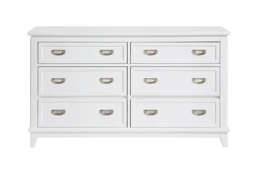 The Chase White 6-Drawer Dresser is a perfect blend of traditional style and modern functionality. Crafted from wood and engineered wood, this dresser features a pristine white finish that adds a touch of elegance to any room. With six spacious dovetail drawers, it offers ample storage space while the polished nickel tone flush ring pulls provide a sophisticated accent. Made of wood and engineered wood, White finish, 6 dovetail drawers with ball bearing glides.