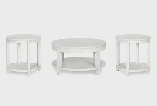 The Chelsey White 3 Piece Round Wood Lift-Top Coffee Table Set brings rustic character and practical function to your living room with a coordinated coffee table and two matching end tables. The round lift-top coffee table raises to create a convenient workspace or snack station while revealing hidden storage for remotes and magazines, and each table includes a lower shelf for extra display or stowaway space. With a rubberwood frame and oak veneer tabletop, the set offers sturdy support and an easy-to-clean surface that fits everyday living.