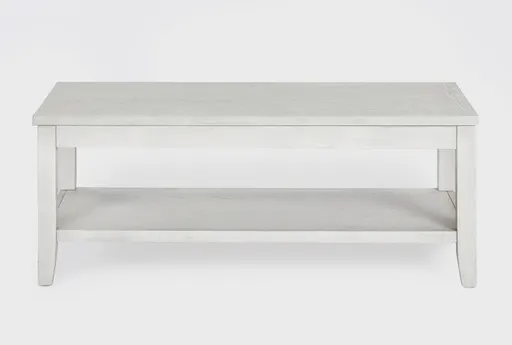 Chelsey White 48" Wide Rectangle Wood Lift-Top Coffee Table brings rustic character to the living room with practical features that make daily life easier. The lift-top raises smoothly to create a comfortable work or dining surface and reveals hidden storage for remotes and chargers, while the lower shelf keeps books and baskets organized and within reach. A rubberwood frame with an oak veneer tabletop provides stable support and simple care for everyday use, making this 48-inch coffee table a functional centerpiece for relaxed living.