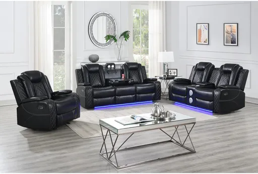Enhance your living space with the Cherice Black 3 Piece Living Room Set. This casual set, crafted from durable faux leather, offers both style and comfort. Perfect for relaxing or entertaining, it includes a sofa, console loveseat, and glider recliner.