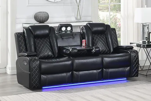 The Cherice Black Sofa is a three-seat reclining sofa upholstered in black faux leather with quilted stitching and a rectangular, theater-style silhouette that feels right at home in a casual living room or media space. It sits on a low platform base and uses a plywood frame with foam-filled cushions to deliver medium-firm support for movie nights and gaming sessions. A center console includes cupholders and USB charging ports, while integrated LED lighting beneath the base and along the console provides ambient glow for evening viewing. Track arms and piped edges give the piece a structured, contemporary profile that’s easy to anchor with rugs and accent tables.