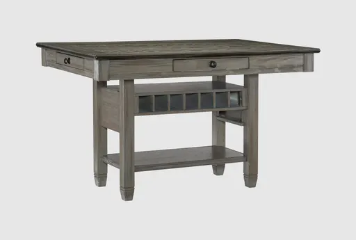 The Chevy Grey 60" Counter Height Table with Drawers is a perfect blend of farmhouse charm and traditional elegance. Crafted from Asian hardwood, this rectangular table features a two-tone coffee and antique gray finish that adds a rustic yet timeless appeal to any space. With practical storage solutions including four dovetail drawers with ball bearing glides and a seven-bottle wine rack, this table is as functional as it is stylish.