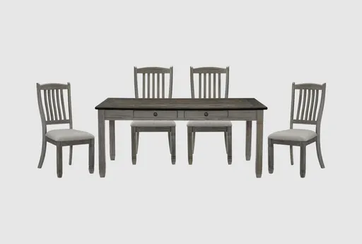 Enhance your dining experience with the Chevy Grey Wood Rectangular 72" Dining Table Set. This stylish farmhouse table, featuring coffee and antique grey tones, is perfect for any dining room or kitchen. The set includes four seating spots and convenient storage drawers, making it both functional and visually appealing.