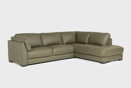 Cillian Olive Green 115" Sectional with Right Arm Facing Corner Bumper Chaise brings roomy, modern seating to large living rooms, with a right-facing chaise that creates an inviting L-shaped layout for lounging and conversation. It is upholstered in 100% top-grain leather on seating surfaces with pu match on less visible areas, giving the sectional a cohesive look while keeping care straightforward. The two-piece design ships in sections for easier delivery and placement, and a durable wood frame provides solid support for everyday use.