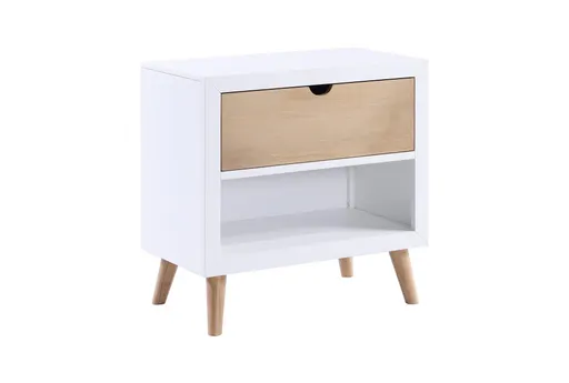 The Clancy Multicolor White 1-Drawer Nightstand is a perfect addition to any modern bedroom. Its sleek design integrates seamlessly with both kids' rooms and adult spaces, offering functionality and style. The white and natural color combination provides a fresh, neutral look that complements various décor themes.