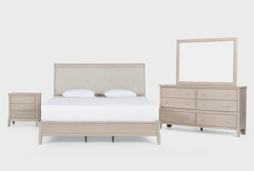 The Clara California King Sleigh Bed With Nightstand Dresser And Mirror brings a traditional presence to the bedroom with a panel headboard and classic sleigh silhouette that anchors a coordinated set. The collection combines mindi veneer and solid hardwood with a faux leather upholstered headboard finished in polyurethane for a durable, easy-care surface. Dresser and nightstand provide roomy drawers, the bed accommodates a California King mattress and box spring, and an assembly video guides setup. Includes a California King sleigh bed, nightstand, dresser and mirror for a complete bedroom solution. Materials: mindi veneer and solid hardwood frame with a faux leather headboard finished in polyurethane for everyday durability. Function: panel headboard, generous dresser storage, supports a California King mattress and box spring