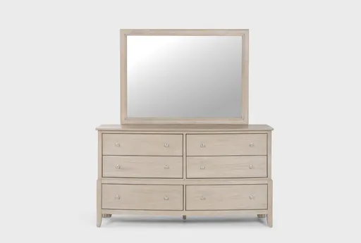 Clara 6 Drawer Dresser And Mirror combines a classic silhouette with practical storage in a soft beige finish that complements a neutral palette. Six generous drawers glide on side metal glides to keep clothing and linens organized, while the horizontal rectangular mirror offers a full dressing view and a smooth glass surface for morning routines. Solid hardwood accents paired with veneer surfaces showcase textured wood grain and reinforce structural integrity. The freestanding design and clean lines suit traditional and transitional bedrooms while offering dependable bedroom storage.