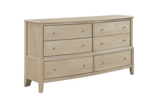 The Clara 6 Drawer Dresser offers generous bedroom storage with six roomy drawers that keep clothing and linens organized. It combines a mindi veneer finish with a solid hardwood frame for reliable support and natural grain character. The traditional silhouette fits a range of décor and the broad top provides a handy surface for a lamp, organizers, or folded items.