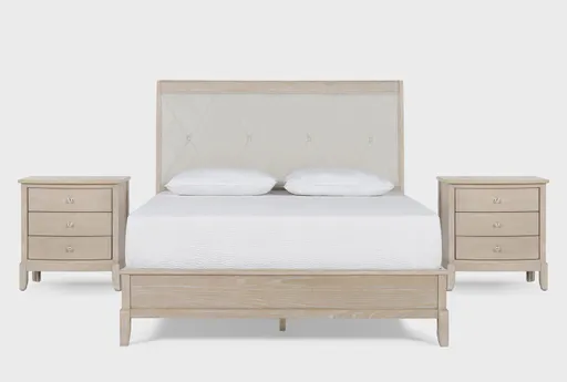 Clara Queen Sleigh Bed With 3 Drawer Nightstand Set Of 2 pairs a queen panel sleigh bed with two three-drawer nightstands for a coordinated, storage-focused bedroom solution. The headboard is upholstered in faux leather over a polyurethane base cloth, and the bed features integrated storage drawers for linens and extras. Mindi veneer with solid hardwood elements provides dependable structure while the nightstands' three drawers keep bedside essentials organized, and an assembly video makes setup straightforward.