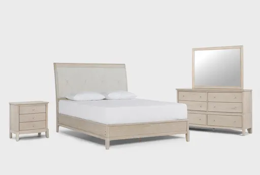 Clara Queen Sleigh Bed With Nightstand Dresser And Mirror brings a traditional bedroom set centered on a faux leather upholstered sleigh headboard and coordinating storage pieces. The frame combines mindi veneer and solid hardwood for steady support, while the headboard is upholstered in faux leather with a polyurethane backing for easy care. Includes a queen sleigh bed plus a nightstand, three-drawer dresser and mirror, and an assembly video to guide setup so you can focus on arranging the room.
