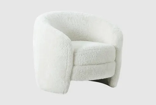Experience modern comfort with the Clara White Faux Shearling Accent Barrel Arm Chair. Its round, club-style design and firm foam cushions provide the perfect seating solution for any room. The faux shearling fabric adds a soft touch, making it an ideal lounge chair for kids, living rooms, or bedrooms. Modern curved design with a supportive back and arms. Durable faux shearling fabric in a neutral white color. Perfect for various rooms including kids' spaces, living rooms, and bedrooms.