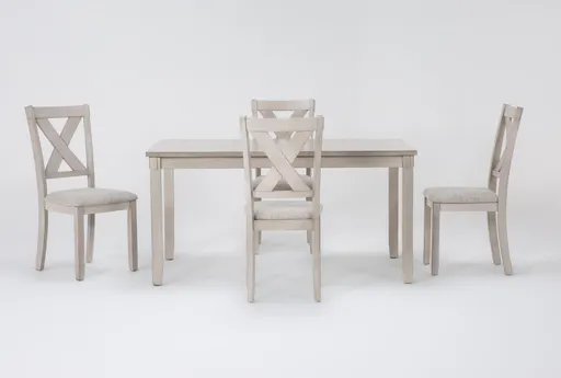 The Clari Grey White Rectangular 60" Wood Dining Table with Chair Set for 4 is a perfect blend of farmhouse charm and classic elegance. Crafted from MDF with a hickory veneer, this dining set features a weathered finish that adds a rustic touch to your dining space. The solid wood legs and upholstered seats ensure both durability and comfort, while the X-back chairs provide a stylish and supportive seating option.