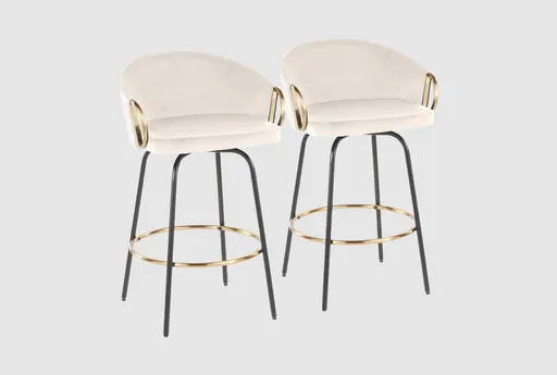 The Clarity 26" Cream Counter Stool Set of 2 is a modern, tall set of stools perfect for your dining room. The stools are made of velvet and metal, with a unique braided upholstery that adds a contemporary touch to any space. Contemporary styling with unique braided upholstery. Fixed counter height for comfortable seating. Constructed from velvet fabric, foam, and painted steel in cream and black colors.