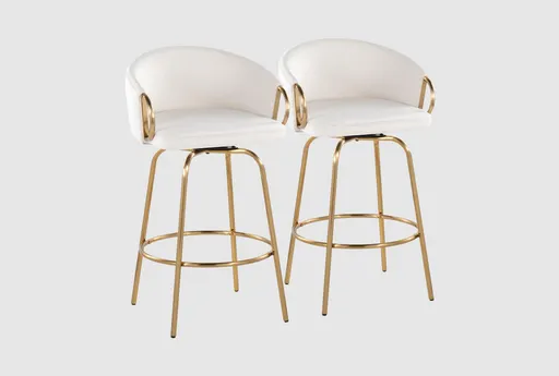 Enhance your kitchen or dining area with the Clarity 26" Cream Velvet Counter Height Stool Set Of 2. These stools feature a fixed counter height with a 360-degree swivel, providing both style and functionality. The sleek velvet upholstery in a soft cream color adds a touch of elegance, while the gold metal legs with a round gold footrest offer a contemporary flair. Perfect for any modern home, this set includes two counter stools.