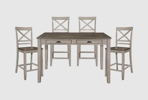 The Claudia Grey 59" Dining With Drawers Set For 4 combines farmhouse charm with traditional elegance. Featuring a 2-tone finish in brown and light gray, this rectangular dining set is crafted from wood and engineered wood, including Asian hardwood. The counter height design and four dovetail drawers with ball bearing glides add both style and functionality to your dining space.