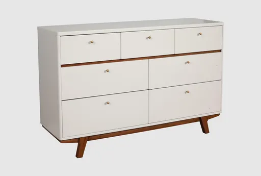 The Clearview White 7-Drawer Dresser is a stunning addition to any modern bedroom. Featuring a sleek white finish with acorn accents, this dresser combines contemporary design with mid-century modern flair. Crafted from plantation mahogany solids and okoume veneer, it offers both durability and style. Features seven spacious drawers for ample storage.
