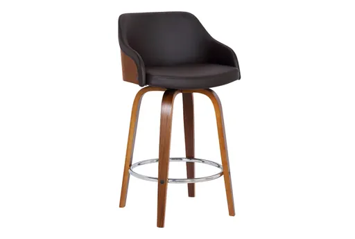 The Clem 26" Brown Faux Leather And Walnut Wood Swivel Counter Height Stool brings modern comfort to the dining room with a contoured seat upholstered in brown faux leather and a supportive wraparound back. A poplar and plywood frame provides sturdy support while the chrome steel footrest offers a reliable place to rest your feet during long meals. Its 26-inch counter height and 360-degree swivel make sitting down and getting up effortless, so it fits seamlessly into casual dining or kitchen island settings.