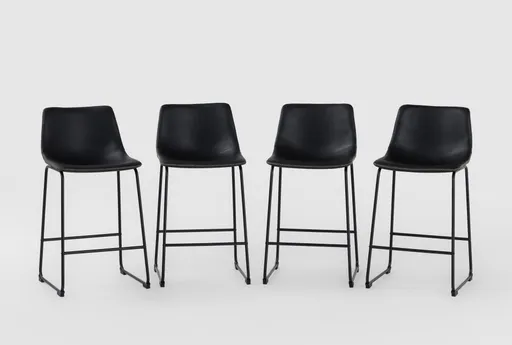 Enhance your dining experience with the Cobbler Black 26" Faux Leather Bucket Seat With Baseball Stitch Counter Height Stool With Back Set Of 4. These modern stools feature a sleek black faux leather upholstery that adds a touch of sophistication to any dining room or kitchen. The bucket seat design and tight back provide comfort and support, making them perfect for long meals and gatherings.